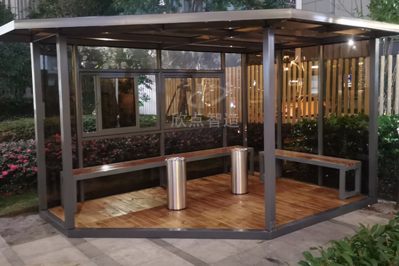 2、吸煙亭座椅材質。吸煙亭座椅我們一般選擇防腐木的偏多,吸煙亭一般是室外的,墻體為鋼化玻璃,夏天比較炎熱的情況下面。如果座椅采用不銹鋼的就會容易燙傷,而選擇防腐木哪怕在炎熱的夏天也不會出現燙傷人的情況,因為防腐木具有很好的導熱性。