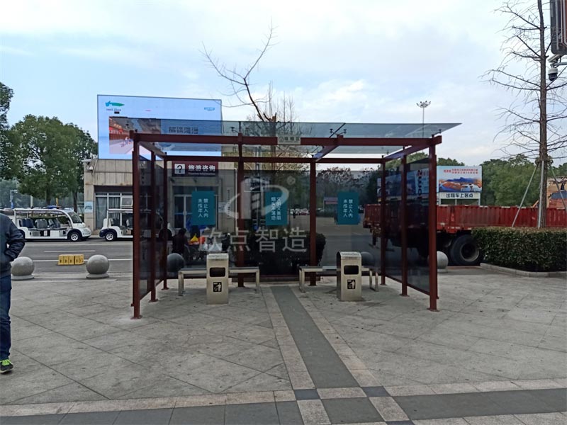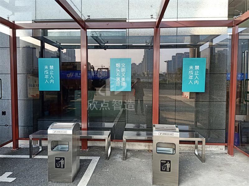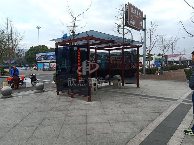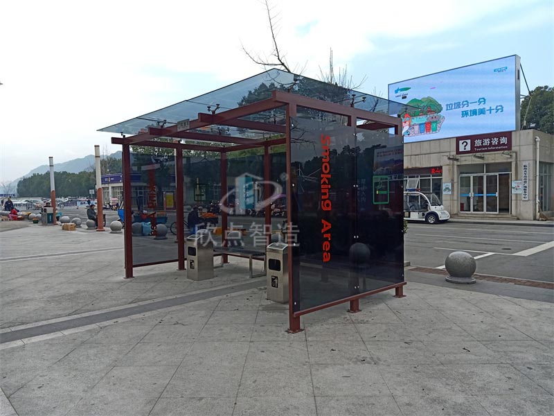 鋼化玻璃吸煙亭:光線明亮,安裝方便,工廠組裝好成品整體運(yùn)輸?shù)跹b到位,堅固耐用,使用壽命至少十年,重型鋼結(jié)構(gòu),抗臺風(fēng)。頂部使用鋁板防水隔熱材料,保證下雨不漏水,隔音效果優(yōu)良。并且內(nèi)置電路,只要通電就可以在亭內(nèi)使用電力設(shè)施,室內(nèi)配置休息椅和煙灰桶,方便的功能,時尚的外觀,實(shí)在是廣大禁煙場所的不二之選!